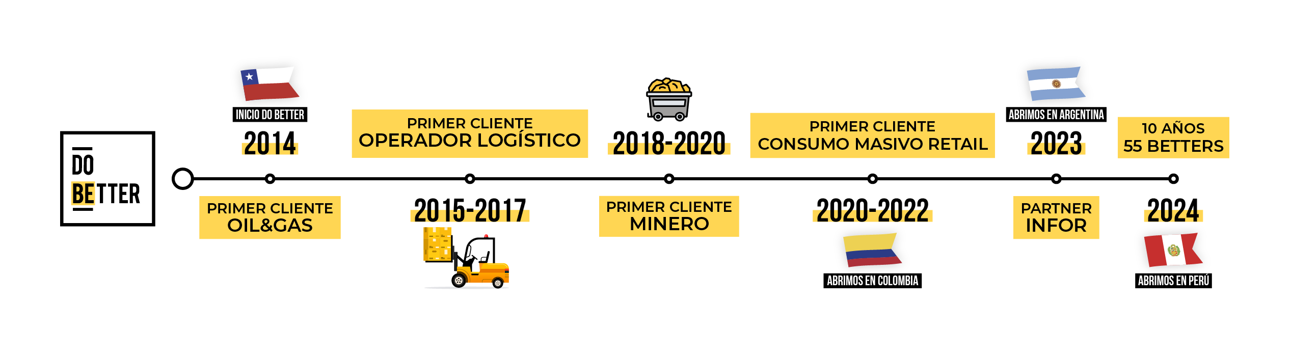 Desde 2014 hemos construido una historia que combina crecimiento, innovación y confianza. Comenzamos con un cliente del sector Oil&Gas en Chile, y desde ahí nos expandimos: